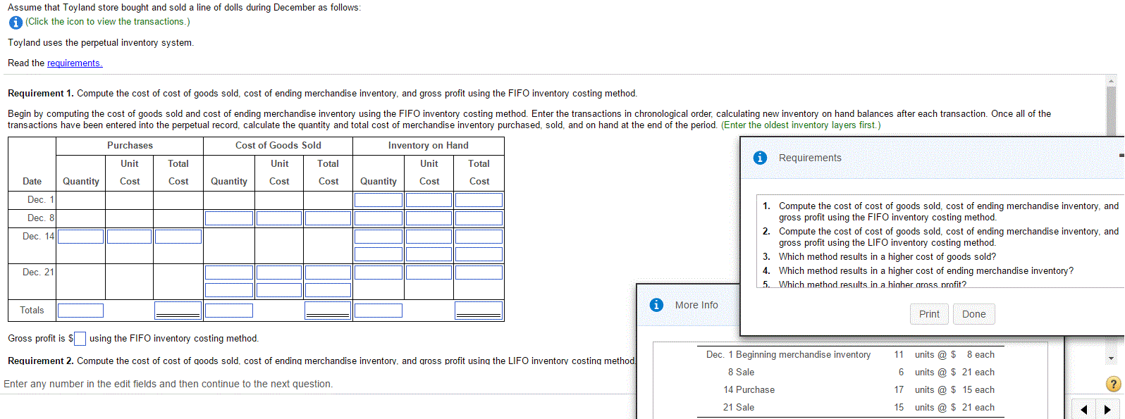 . The controller uses the information in the above table to calculate the cost of goods sold for the month of December as well as inventory balance as of the end of December. 300 500 06 or 60. Compute gross profit for August using FIFO LIFO and weighted-average inventory costing methods Sales Revenue Cost of Goods Sold Gross profit 5200 FIFO 5500 LIFO 5260 Weighted-average Requirement 1.